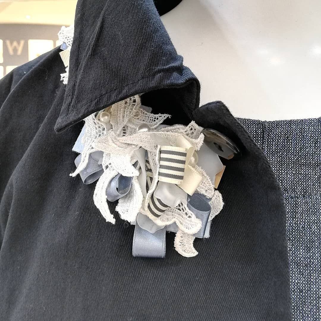 すこし大きめのコサージュは、顔やコーディネートがぐっと華やかに見えたり、ちょっと小顔な感じにも見えたりするので、すごく便利です。