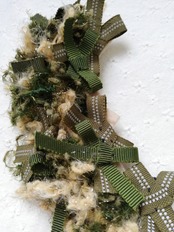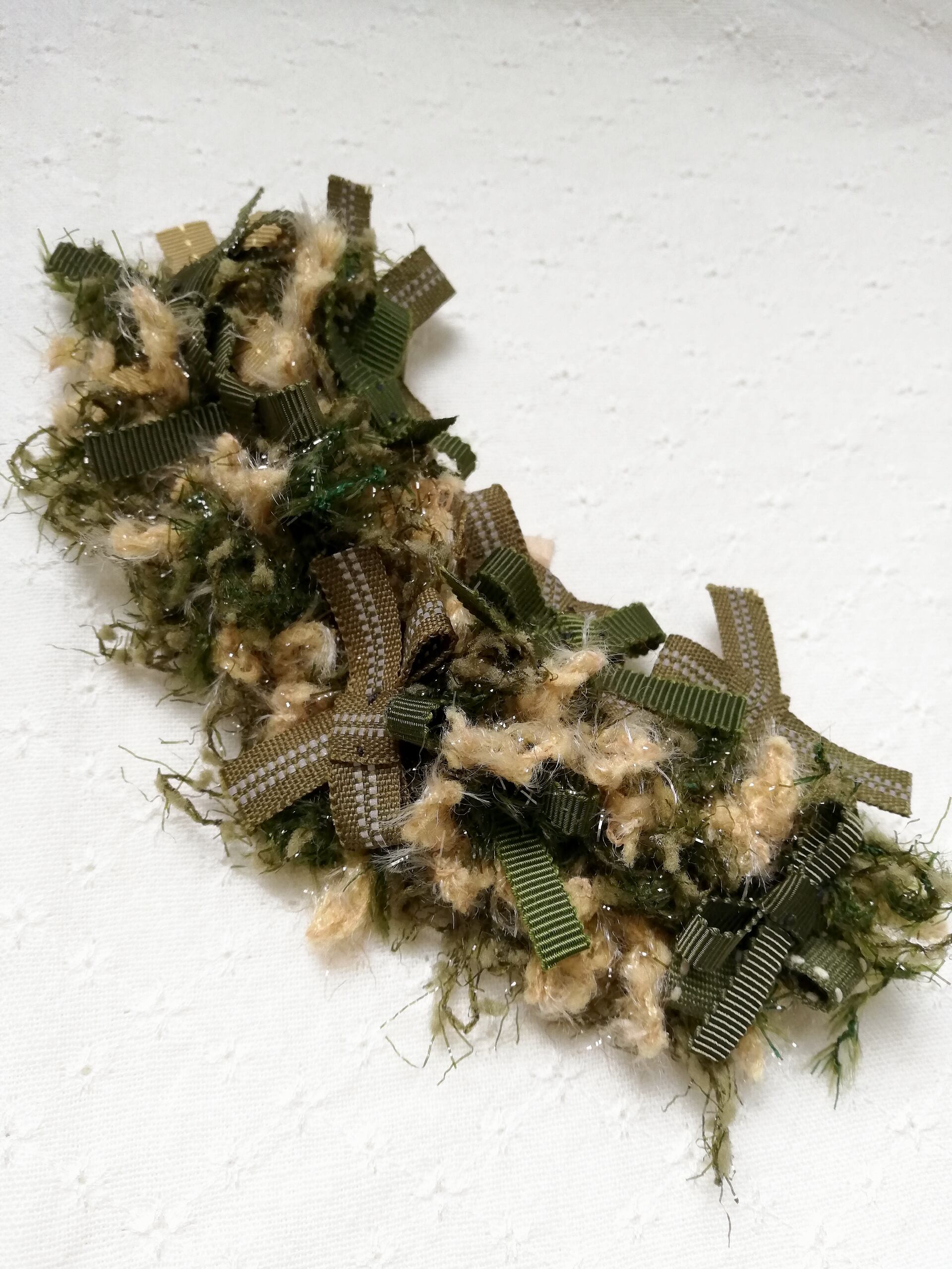 グリーンのリボンも濃淡をセレクトして。どんな服にも合わせやすい、顔まわりをやわらかく、華やかに魅せてくれるコサージュです。