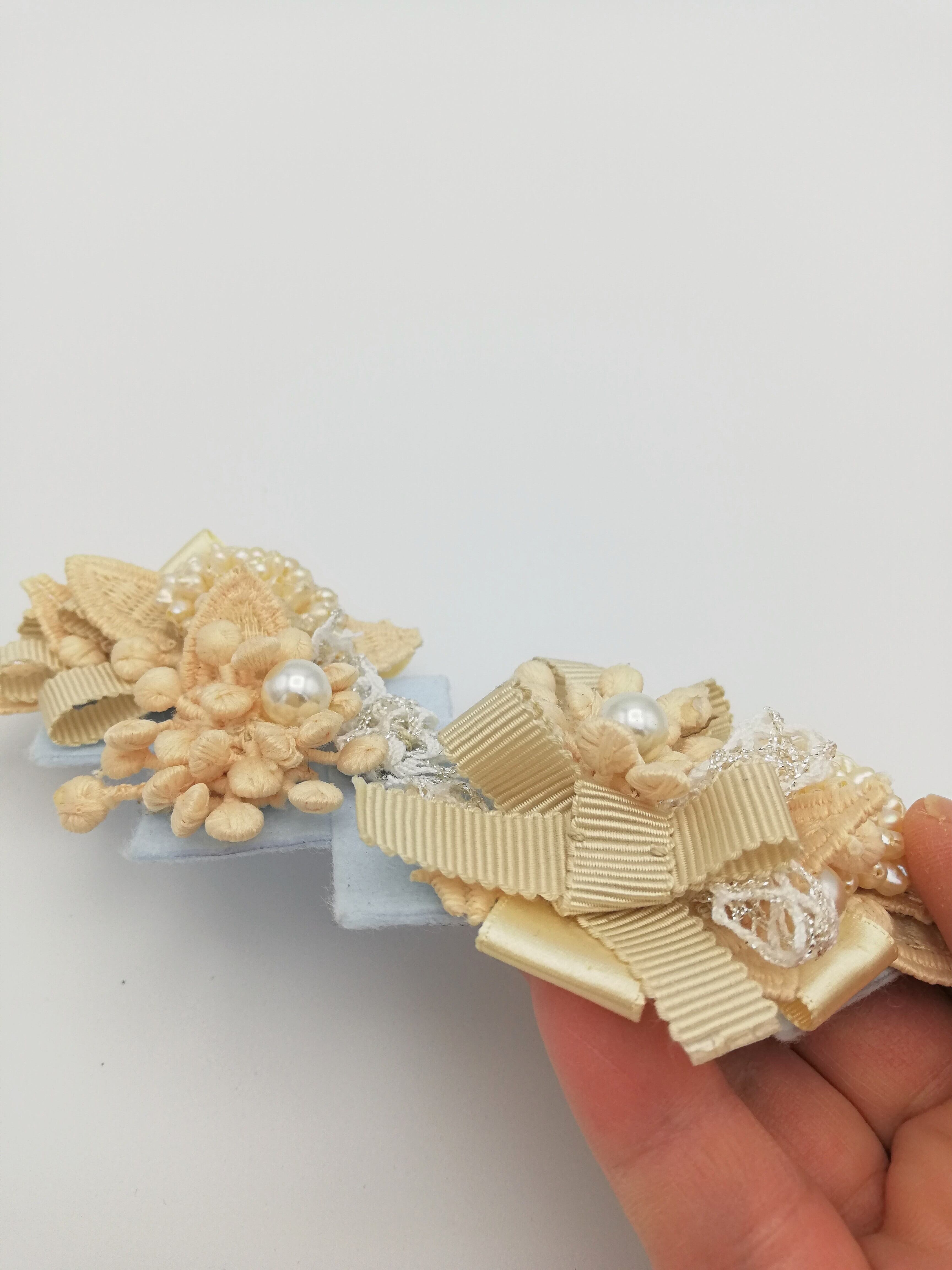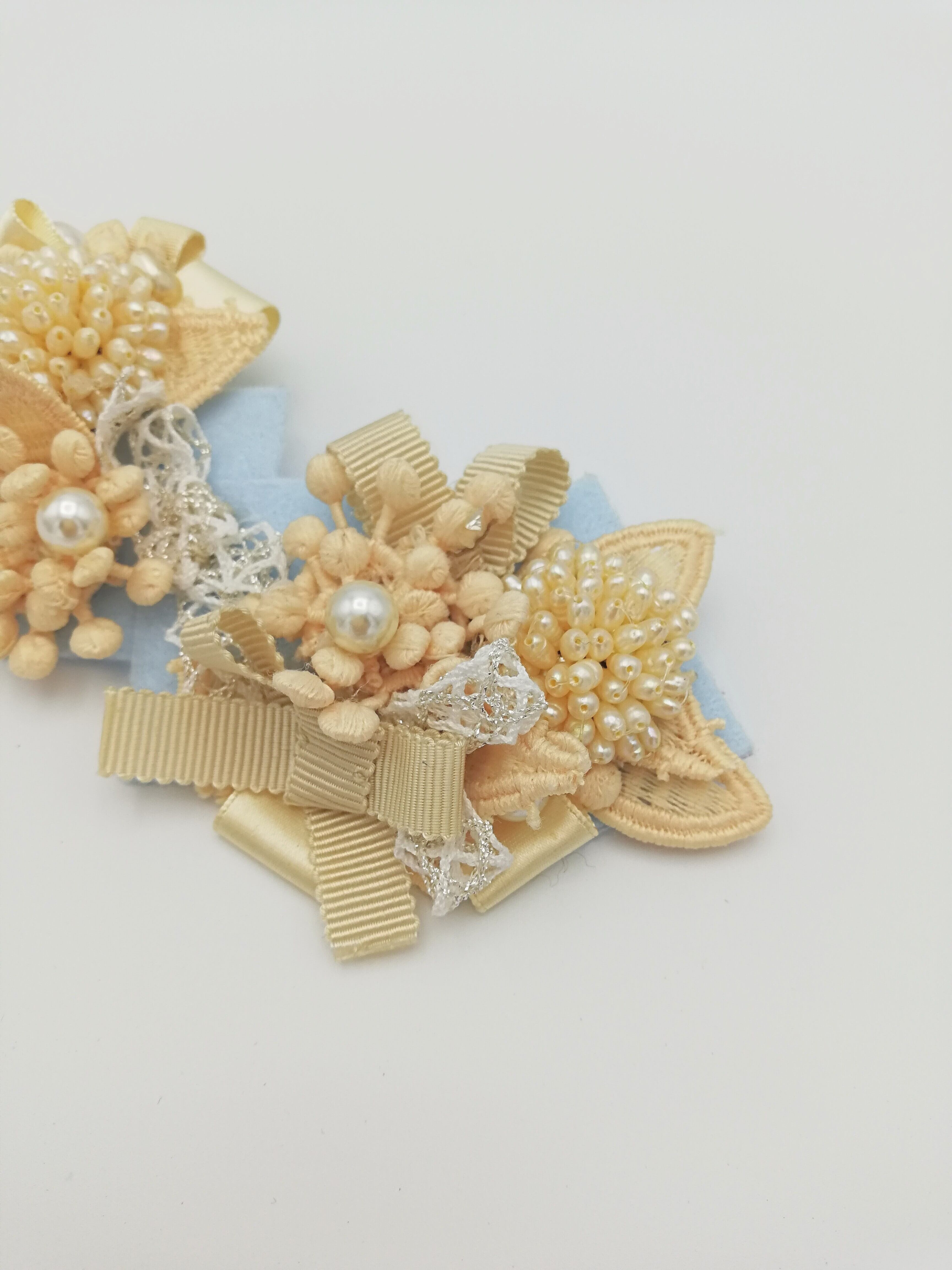 やさしい気分に。リボンとビーズとお花のブローチ。