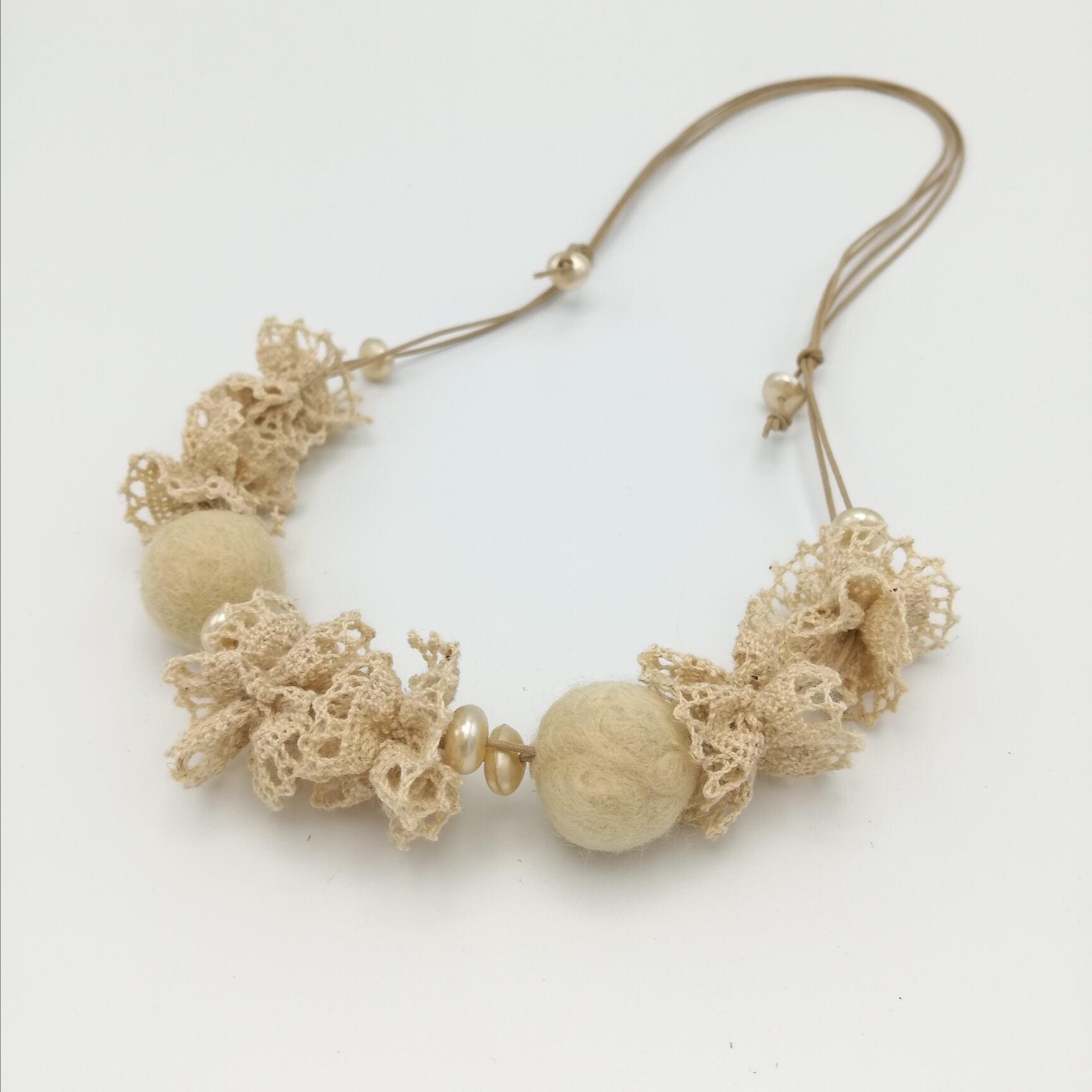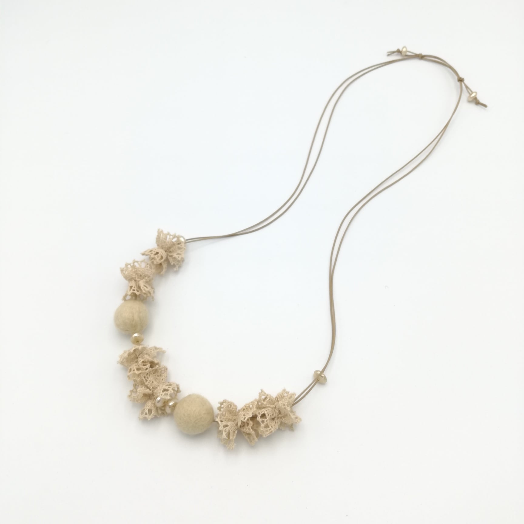 【エクリュ ネックレス】ベージュ・羊毛フェルト・フェルト・フェルトボール・レース~フェミニンにも、甘辛コーデにも。かわいいネックレスです。