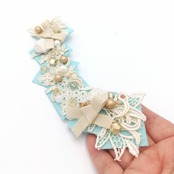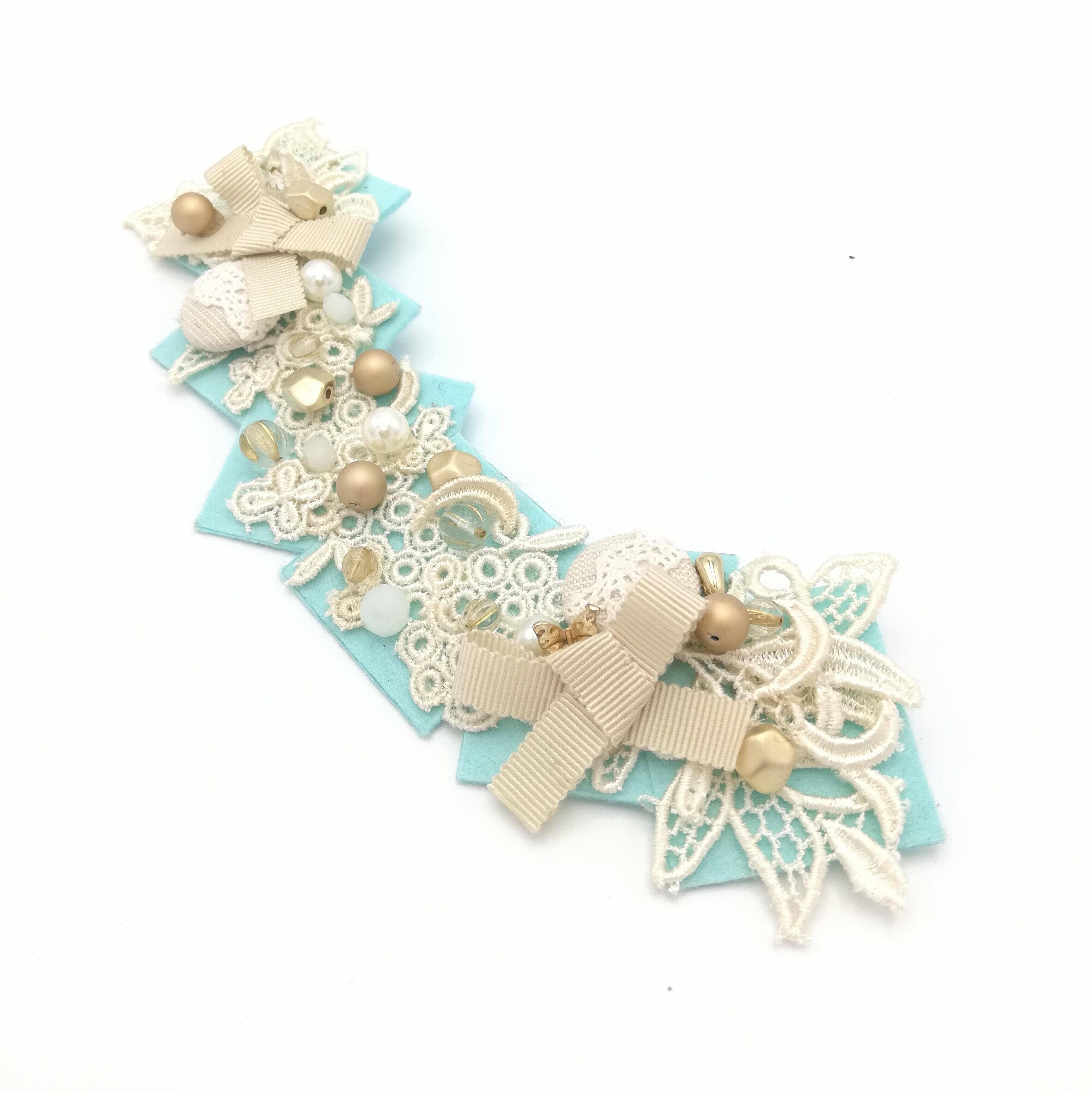 美しいライトブルーとやさしいエクリュでまとめた、ツートンカラーのブローチ。レースとリボンが襟元にやさしい印象をつくります