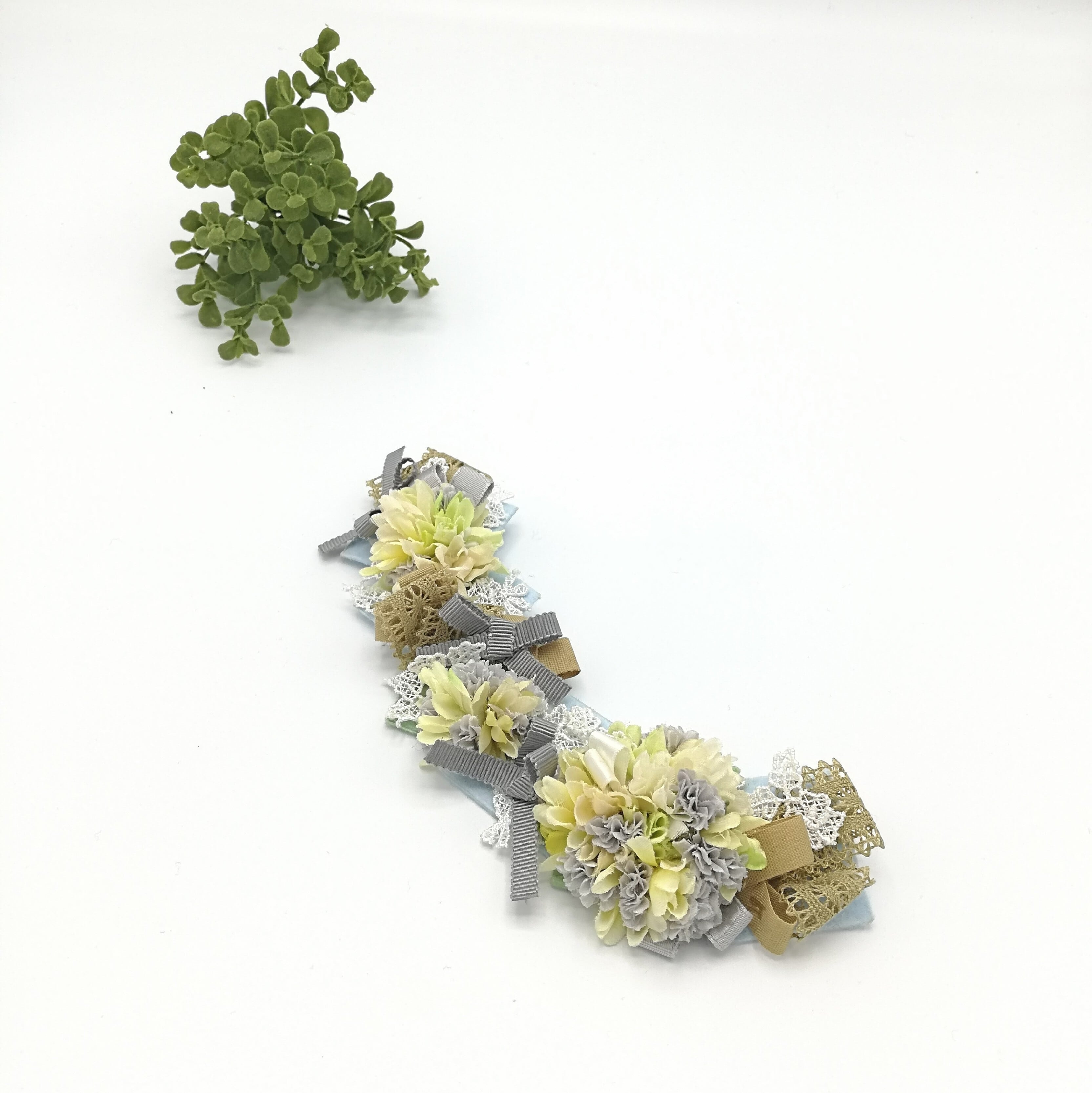 /リボン/レース/パステル/黄緑/イエロー/黄色/グレー/カラシ/リボンブローチ/アーティシャルフラワー/花/お花/フラワー/